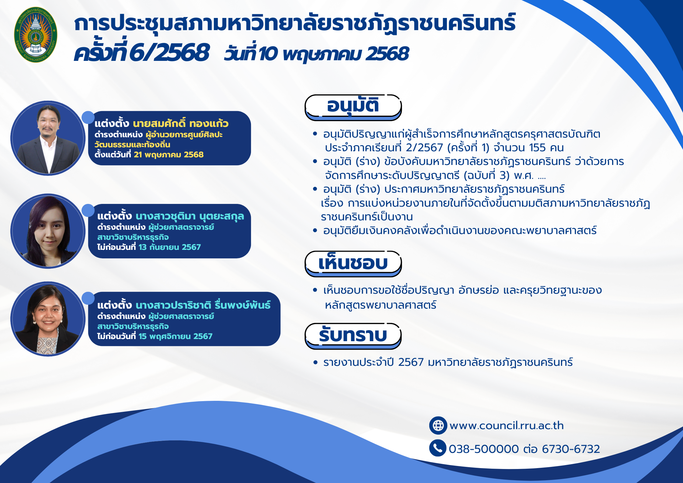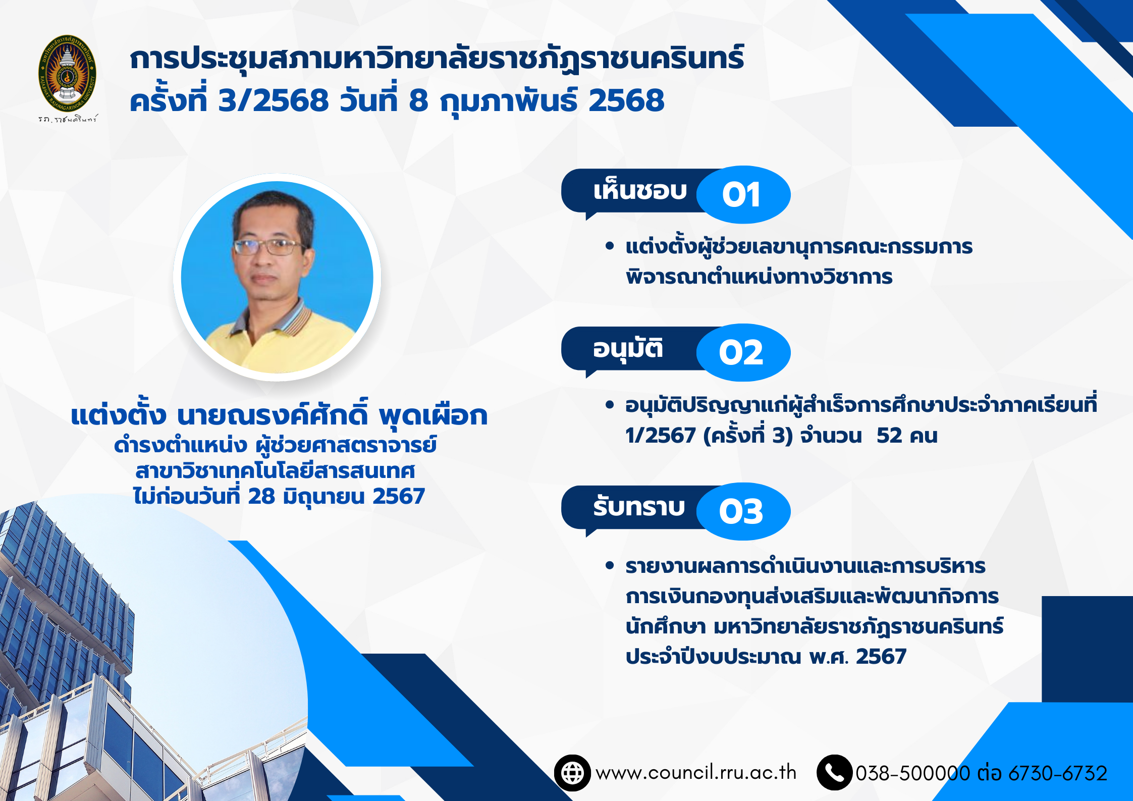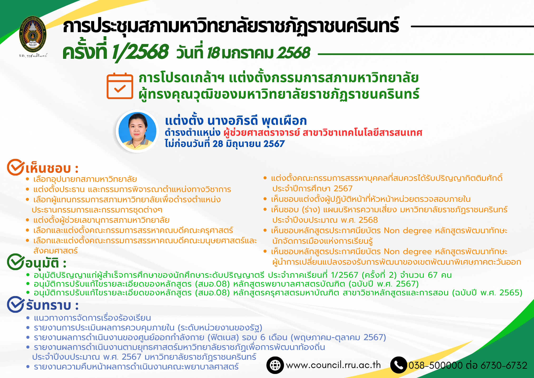 Home ข่าวประชาสัมพันธ์ ขอเชิญสมัครและเสนอชื่อเพื่อเข้ารับการสรรหาผู้อำนวยการสถาบันวิจัยและพัฒนา ประชุมสภามหาวิทยาลัยราชภัฏราชนครินทร์ ครั้งที่ 13/2568 วันเสาร์ที่ 13 ธันวาคม 2568 มติที่ประชุมสภามหาวิทยาลัย 7-25686-25685-25684-2568spa3-2568rsp12568Load MoreEnd of Content. ประมวลภาพกิจกรรม ดูรูปภาพเพิ่มเติม พิธีพระราชทานปริญญาบัตร มหาวิทยาลัยราชภัฏราชนครินทร์ ประจำปีการศึกษา 2565-2566 November 2, 2025November 5, 2025 มอบเกียรติบัตรให้แก่บุคลากรและนักศึกษา February 11, 2025February 11, 2025 มอบเกียรติบัตรแก่ผู้ได้รับแต่งตั้งให้ดำรงตำแหน่งทางวิชาการ February 11, 2025February 11, 2025 พิธีรับพระบรมราชโองการโปรดเกล้าโปรดกระหม่อมแต่งตั้งกรรมการสภามหาวิทยาลัยผู้ทรงคุณวุฒิ และอธิการบดี February 10, 2025February 11, 2025 ประชุมสภามหาวิทยาลัยราชภัฏราชนครินทร์ ครั้งที่ 10/2567 วันที่ 14 กันยายน 2567 October 3, 2024October 3, 2024 การนำเสนอวิสัยทัศน์และแนวทางการบริหารคณะวิทยาการจัดการ วันที่ 12 กันยายน 2567 September 13, 2024October 3, 2024 คณะต่างๆ สถาบัน สำนัก ศูนย์ สำนักงานสภามหาวิทยาลัยราชภัฏราชนครินทร์ มหาวิทยาลัยราชภัฏราชนครินทร์ 422 ถนนมรุพงษ์ ตำบลหน้าเมือง อำเภอเมือง จังหวัดฉะเชิงเทรา 24000 โทรศัพท์ 0-38500-000 ต่อ 6730 – 6732 E-mail : councilrru@gmail.com